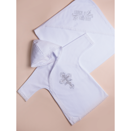 Торжественный крестильный набор создан для самого важного события в жизни малыша — Таинства Крещения. Комплект состоит из двух незаменимых предметов: удлиненной крестильной рубашки с капюшоном и большой пеленки с уголком. Изделия выполнены из мягкого 100% хлопка, который моментально впитывает влагу и дарит комфорт нежной коже младенца после купели. Рубашка для крещения имеет свободный крой и удобные завязки, позволяя быстро и легко переодеть ребенка. Капюшон защитит голову малыша от сквозняков в храме, а изящная вышивка в виде креста придает образу особую святость. Пеленка с уголком (крыжма) декорирована нежным кружевом и вышивкой, она идеально подходит для принятия ребенка из рук священника и проведения праздничной фотосессии. Этот комплект для крещения станет прекрасным подарком от крестных родителей. Натуральная ткань гипоаллергенна, отлично переносит стирку и сохраняется как семейная реликвия на долгие годы. Подходит как для мальчика, так и для девочки (унисекс).