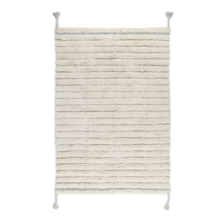 - Ковер бренда Nattiot "Dalia" — бархатный ковер в виде крупных полос в бежевом цвете и подчеркнутый линией небесно-голубого цвета по краям ковра.