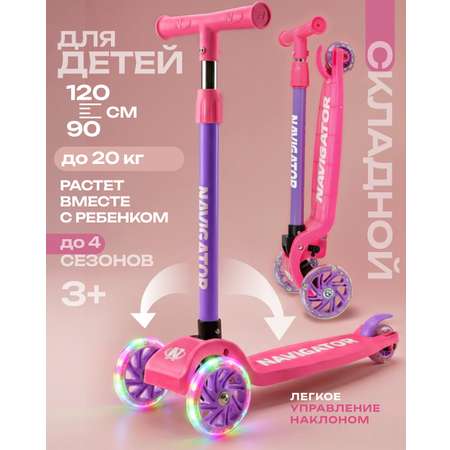 Самокат детский Navigator с управлением наклоном и светящимися колёсами создан для первых самостоятельных поездок! Самокат трехколесный разработан специально для малышей от 3 лет с ростом от 90 до 120 см. Его лёгкая и устойчивая конструкция помогает ребёнку интуитивно освоить основы координации, баланса и направления движения, делая катание естественным и безопасным.