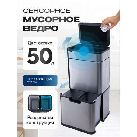 Особенности:- Сенсорное управление минимизирует контакт рук с поверхностью ведра, повышая уровень гигиены.- Универсальный объем: общий объем 50 литров, раздельная конструкция на два отсека и 4 съемных контейнера – идеально подходит для жилых помещений и коммерческих объектов.- Дизайн: стильный и современный дизайн – корпус из нержавеющей стали легко очищается и сохраняет эстетичный внешний вид.- Источник питания: стандартные батарейки типа AA (в комплект не входят) – хватит на длительный период эксплуатации.