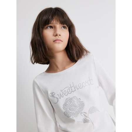 Лонгслив с рукавами клеш для девочки представляет собой модный айтем для создания изящных образов. Лонгслив изготовлен из трикотажного полотна, которое приятно на ощупь. Модель посадки regular предполагает приталенный крой со стандартной линией плеча. Утонченный штрих придают расклешенные длинные рукава. Широкая округлая горловина не мешает при одевании. Лонгслив украшен спереди принтом из сияющих серебристых стразов и милой надписью "SWEETHEART" [англ. - "Дорогая"]. Дополнительный блеск придает россыпь серебристых стразов. Базовый белый цвет модели позволит создавать интересные повседневные образы. Лонгслив со стразами для девочки составит отличный лук с трендовыми широкими джинсами. Модель представлена в двух цветах: коричневом и белом.
