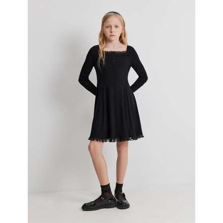 Черное платье для девочки — это универсальная и стильная модель, отличающаяся оригинальными дизайнерскими решениями. Платье изготовлено из мягкого и эластичного трикотажа в рубчик, который приятен на ощупь. Модель прилегающего силуэта с расклешенной юбкой обеспечивает комфортную посадку по фигуре. Платье с длинным рукавом подойдет для прохладной погоды. Нестандартный квадратный вырез горловины придает образу оригинальный штрих. Спереди расположена короткая застежка на пуговицы, облегчающая одевание. Свободная юбка состоит из нескольких клиньев, что делает её более пышной и дарит легкость движений. Подол платья и линия горловины отделаны черным кружевом, вносящим в лук нежный акцент. Черное платье для девочки-подростка подойдет для повседневного ношения, делая каждый день стильным и незабываемым.