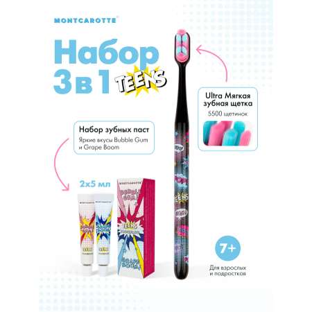 Комплект MontCarotte TEENS — идеальное решение для подростков и взрослых старше 7 лет. В набор входят две мини-пасты с яркими вкусами Bubble Gum и Grape Boom и инновационная ультрамягкая зубная щётка MontCarotte Teens Collection, созданная специально для безопасного и эффективного ухода в подростковом возрасте. Мини-пасты TEENS (2×5 мл) Пасты имеют мощную формулу с 1450 ppm фтора и активными компонентами для защиты от кариеса, осветления эмали и профилактики подросткового гингивита. Эритритол и дикальций фосфат мягко очищают и полируют эмаль, а лизоцим снижает воспаление дёсен и препятствует образованию налёта. Пасты подходят детям 7+, взрослым, пациентам с брекетами и людям с чувствительной эмалью. Безопасны при диабете I и II типа. Зубная щётка MontCarotte Teens Первая в мире щётка, созданная специально для подростков. Ультрамягкое гипоаллергенное PBT-волокно и технология термического крепления обеспечивают высокую плотность щетинок и надёжность. В головке — 5500 тончайших щетинок, разделённых на 8 монопучков. Такая конструкция гарантирует эффективное очищение даже при чувствительных дёснах и наличии ортодонтических конструкций (брекетов). Щётка легко адаптируется под форму зубов, мягко удаляет налёт и не травмирует эмаль. Преимущества набора: • безопасное очищение и защита от кариеса; • мягкое отбеливание и реминерализация; • профилактика гингивита у подростков; • щётка подходит для брекетов и чувствительных дёсен; • компактные мини-пасты удобно брать в школу, спортзал, в поездку; • набор мотивирует подростков к регулярной гигиене благодаря вкусам и современному дизайну. Комплектация: • зубные пасты 5 мл — 2 шт.; • зубная щётка Teens — 1 шт. Подходит: детям 7+, подросткам, взрослым, людям с брекетами, чувствительной эмалью и высокой склонностью к кариесу.