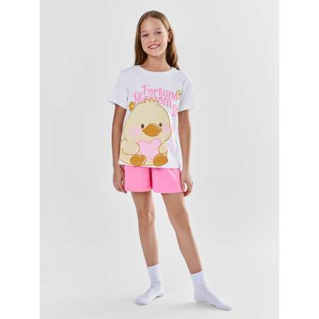 Трендовый дизайн: Сочетание классического белого верха с яркими розовыми шортами и милым современным принтом выглядит стильно и актуально. Рисунок выполнен качественными красками, которые не трескаются и не тускнеют после стирок.