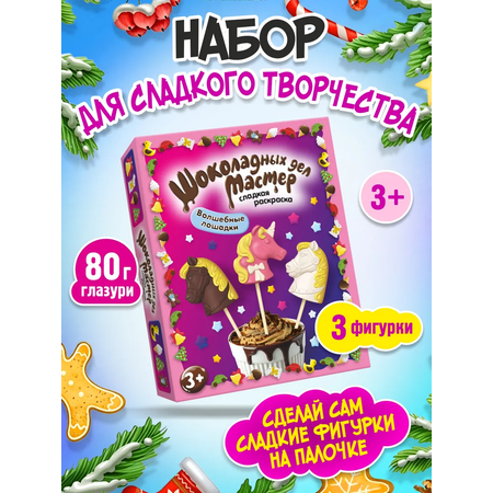 Юные шеф повара и кондитеры самостоятельно приготовят шоколадные конфеты на палочке в форме символа года огненной лошади. В комплекте цветная глазурь, фигурные формы коня и палочки. На коробке есть понятная инструкция - ребенок от 5 лет сможет легко разобраться сам, особенно если он увлекается готовкой или любит создавать поделки.