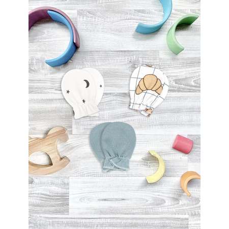 3 пары стильных рукавичек на резиночке – необходимая вещь при уходе за маленьким ребёнком. Антицарапки рассчитаны на детей с первых дней жизни и до 2-3х месяцев, пока младенец ещё не контролирует свои движения и может себя поцарапать. Для защиты нежной кожи от крошечных, но острых ноготков, рекомендуем надевать рукавички малышу в период бодрствования и сна, а также под пеленальный кокон.