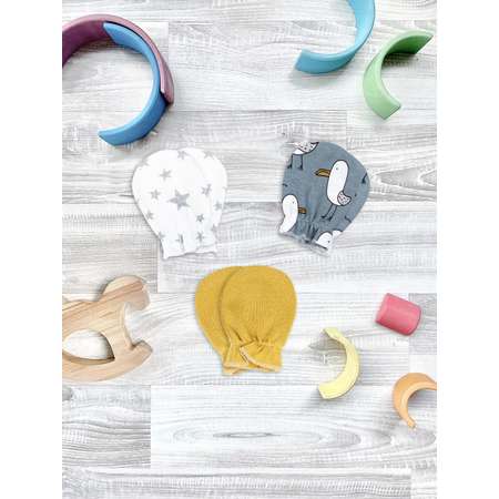 3 пары стильных рукавичек на резиночке – необходимая вещь при уходе за маленьким ребёнком. Антицарапки рассчитаны на детей с первых дней жизни и до 2-3х месяцев, пока младенец ещё не контролирует свои движения и может себя поцарапать. Для защиты нежной кожи от крошечных, но острых ноготков, рекомендуем надевать рукавички малышу в период бодрствования и сна, а также под пеленальный кокон.