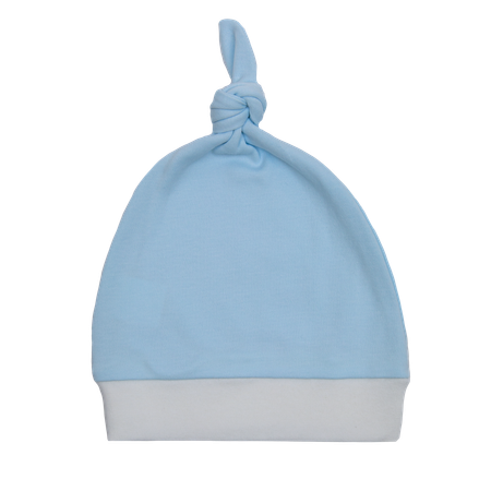 Стильная легкая шапочка для мальчиков из 100% хлопкового трикотажа нежного голубого цвета. Модель в форме колпака с аккуратным узелком создает трогательный образ и надежно защищает от прохлады. Идеально сочетается с другими вещами базовой коллекции - кофточкой и ползунками