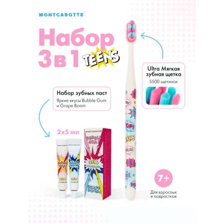 В набор входят: две мини-пасты с яркими вкусами Bubble Gum и Grape Boom и инновационная ультрамягкая зубная щётка MontCarotte Teens Collection, созданная специально для безопасного и эффективного ухода в подростковом возрасте.