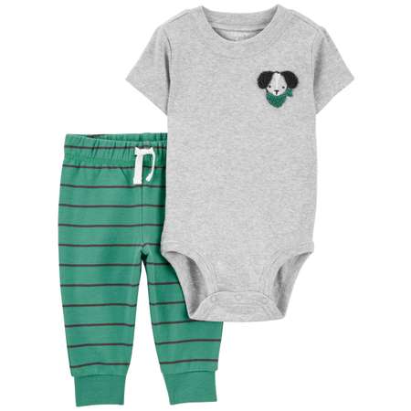 Комплект из двух предметов для мальчика. Серое боди с короткими рукавами с застежкой на кнопки по линии трусиков для удобства переодевания, объемной нашивкой-аппликацией собачка на груди иширокой трикотажной эластичной горловиной. Брюки зеленого цвета в полоску, пояс на завязках и мягкой резинке и с широкими манжетами по низу брюк.