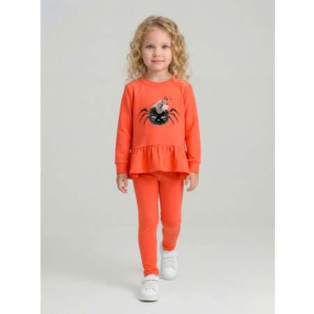 Детали: туника для девочки расширенная к низу с укороченным передом, милым воланом, круглым вырезом горловины, длинным рукавом и модным принтом; облегающие длинные легинсы в поясе с эластичной тесьмой.