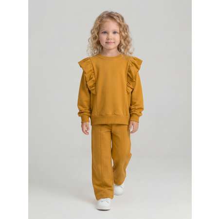 Комплект одежды для девочки KUZA состоит из свитшота и брюк палаццо. Свитшот для девочки на удобных манжетах из кашкорсе. Спереди свитшота расположены декоративные рюши. Брюки для девочки средней посадки, расклешенные к низу, по переду брюк декоративная отстрочка. Комплект изготовлен из 2-х ниточного петельчатого футера с эластаном премиум качества пенье (92% хлопок, 8% эластан).