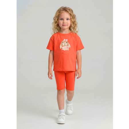 Детали: футболка для девочки свободного силуэта с круглым вырезом, короткими рукавами со спущенной линией плеча и принтом; облегающие коротки легинсы в поясе с эластичной тесьмой.
