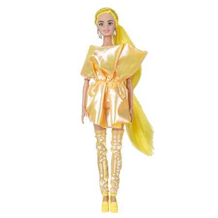 Модница София одета в экстравагантное платье в золотистых тонах из блестящей, с перламутровым отливом, ткани и оригинальным объемным бантом, а также чулки аналогичной расцветки, что подчеркивает её ультрамодный образ. Низ платья представляет собой воздушную юбку-солнце, придающую наряду лёгкость и торжественность. На ногах — туфли жёлтого цвета на высоком каблуке. Образ дополняют изящные серьги-кольца. Одежда и аксессуары легко снимаются и надеваются. С такой модной куклой девочке будет интересно и весело играть: благодаря тому, что руки и ноги куклы подвижны, им можно придать любое положение. У Софии длинные жёлтые волосы, которые хозяйка куклы сможет заплетать в разные причёски. Детально проработанный дизайн игрушки вдохновит девочку на множество интересных игровых сюжетов.
