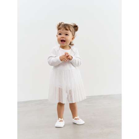 Для красивых образов и праздничного настроения! Нарядное однотонное платье-боди с пышной юбкой из фатина от российского бренда BUNGLY. Мягкий, приятный к телу хлопковый трикотаж платья для девочки. Фигурный вырез горловины и кнопки в плече для удобства переодевания. При смене подгузника не нужно снимать платье полностью – просто расстегните кнопки снизу. Платье для девочки, боди для девочки, платье для новорожденной.