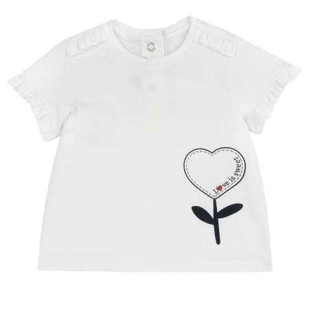 Футболка для девочки. Принт в виде цветка в форме сердца. Эластичный джерси. Устойчивый хлопок. Продукция, сертифицированная по стандарту OEKO-TEX: качество для вашего малыша. Оборка внизу рукава. До размера 086/18 месяцев застегивается на кнопки на спине. Круглый вырез горловины.