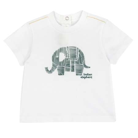 Футболка для мальчика. Принт с животными. Хлопковый джерси. Устойчивый хлопок. Продукция, сертифицированная по стандарту OEKO-TEX: качество для вашего малыша. Эластичный воротник в рубчик. До размера 086/18 месяцев застегивается на кнопки на спине. Круглый вырез горловины.