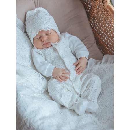 Нежный комплект для новорожденных с элегантным кружевом идеально подойдёт на выписку из роддома и для первой фотосессии. Нательный комплект из 100% хлопка состоит из комбинезона и шапочки. Данный комплект особенно понравится будущей маме, которая ценит красоту и практичность, потому что комплект можно использовать не только на выписку, но и дома в дальнейшем. Праздничная и в то же время комфортная модель идеальна для выписки. Красиво подарить, удобно хранить - комплект идёт в подарочной коробке.Цвет; Экрю.