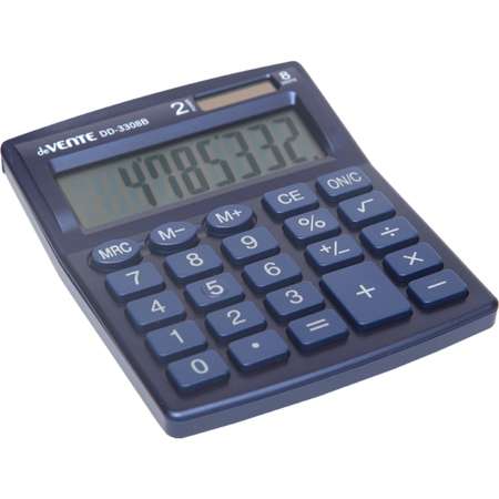 Калькулятор настольный "deVENTE" DD-3308B, 105x127x21 мм, 8 разрядный, автоматическое вычисление квадратного корня, процентов, функция смены знака, работа с памятью, двойное питание, автоматическое отключение, прорезиненные ножки, синий, в картонной коробке