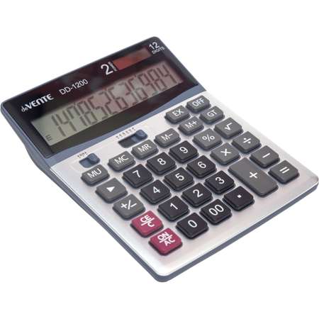 Калькулятор настольный "deVENTE" DD-1200, 140x178x46, 12 разрядный, металлическая панель, автоматическое вычисление квадратного корня, процентов, наценки, функция "общая сумма" замена введенных операторов местами, клавиша "00" коррекция последнего введённого значения, двойное питание, крупные клавиши, черный, в картонной коробке