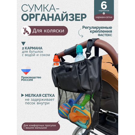 Органайзер имеет несколько отделений : глубокое отделение-сетка на магнитной застежке; два кармана на двойной молнии для различных предметов, таких как игрушки, книги, закуски и другие необходимые вещи; два кармана для бутылок, карман-портфель на молнии размером 17х15х4,5 см с дополнительным отсеком. Общий размер органайзера 45х35 см , вес всего 245 г. Сумка органайзер для коляски также оснащена ремнями, которые позволяют надежно закрепить органайзер на коляске, велосипеде, санках.