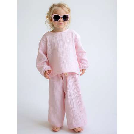 Легкий пляжный наряд состоит из просторных брюк и свободной рубашки с длинными рукавами. Штаны для девочки в стиле палаццо создают элегантный образ, а мягкая кофточка его отлично дополняет. Летний костюм для малышки изготовлен из муслина, который защитит нежную кожу ребенка от палящего летнего солнца.