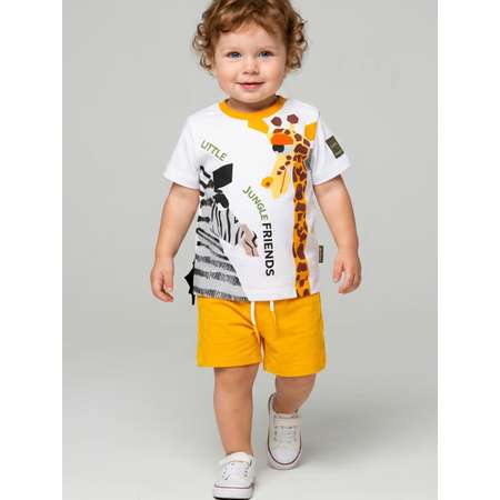 Детский костюм для мальчика. Состоит из футболки и шорт. Выполнен из хлопкового трикотажа. Футболка прямого кроя, с коротким рукавом. На плече застежка на кнопки для удобного переодевания. Яркий принт с милыми животными и нашивка. Декоративная бахрома, имитирующая гриву зебры. Шорты свободные, с эластичным поясом и шнурком для регулировки посадки. По бокам расположены карманы.