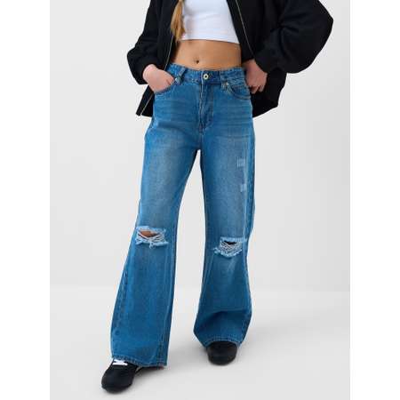 Широкие джинсы wide leg для девочки подростка. Застежка на молнию и болт, пояс дополнительно регулируется внутри с помощью эластичной тесьмы и пуговицы. Изделие выполнено из светло-голубого денима с характерными потертостями и прорезями на передней части. Джинсы имеют свободный крой с прямыми широкими штанинами и посадку на талии. Спереди — два кармана, сзади — два накладных кармана. На одном из них — этикетка с надписью.
