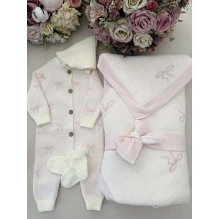 Вязаный комплект на выписку весна лето с бантиками для новорожденных малышей из роддома.