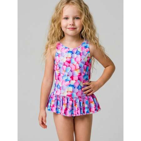 Слитный детский купальник для девочки. Ткань с ярким принтом зефира в пастельных оттенках: розовый, голубой, сиреневый и кремовый. Модель выполнена на широких бретелях. По линии талии пришита легкая оборка, создающая эффект юбочки. На спинке — глубокий вырез и эластичная резинка. Все края обработаны эластичной тесьмой, чтобы изделие хорошо сидело на теле и не натирало. Благодаря UF-защите, ткань сохраняет первоначальный вид даже при длительном пребывании на солнце. Подходит для плавания и активного отдыха.