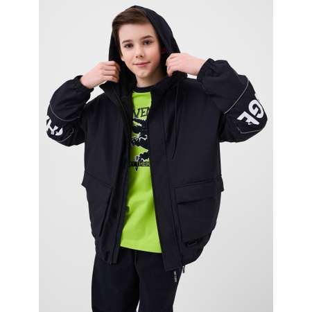 Ветровка на трикотажной подкладке для мальчика подростка. Температурный режим до 15 °C. Ветрозащитное и водоотталкивающее покрытие. Модель выполнена в черном цвете с контрастными белыми деталями. На рукавах — вставки со светоотражающей полосой. Два объемных кармана на липучках с дополнительным боковым входом. Капюшон регулируется шнуром. По низу изделия и на рукавах — мягкие резинки. Внутренний карман на липучке и петелька для вешалки. Светоотражающие элементы добавляют безопасность в тёмное время суток.