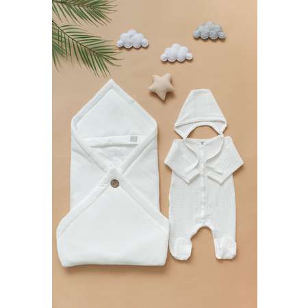 Простой, без лишних деталей, удобно и очень просто застегивается на единственную пуговицу. В комплекте слип на кнопочках, на рукавах антицарапки и чепчик на завязках.