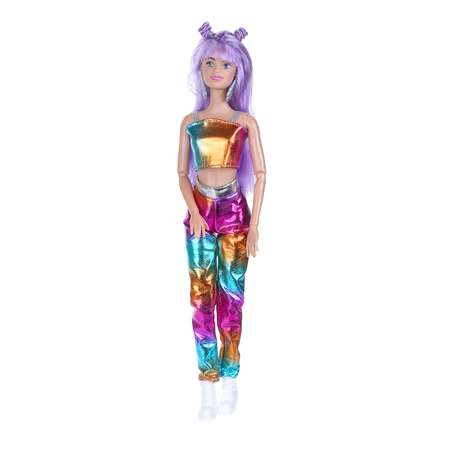 Модница София одета в яркий наряд в бирюзово-фиолетовых и золотистых тонах с верхом из блестящей ткани на тонких бретельках, что подчеркивает её смелый и трендовый образ. Низ наряда представляет собой стильные зауженные брюки с эффектом перелива, украшающие её образ современными акцентами. На ногах — модные ботинки, гармонично завершающие этот креативный и запоминающийся образ Софии. С такой очаровательной куклой девочке будет интересно и весело играть: благодаря тому, что руки и ноги куклы подвижны, им можно придать любое положение. У Софии длинные красивые волосы, которые хозяйка куклы сможет собирать в разнообразные причёски. Детально проработанный дизайн вдохновит девочку на множество увлекательных игровых сюжетов.