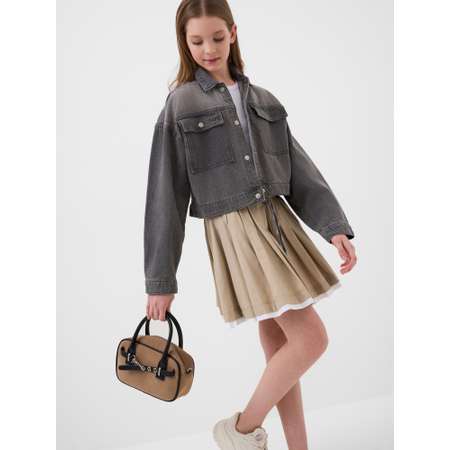 Джинсовая куртка для девочки подростка. Модель выполнена из плотного варёного денима серого цвета. Куртка свободного кроя, длина — чуть выше талии. Спереди расположены два накладных кармана на кнопках. Застежка по центру — на металлических кнопках. Рукава с манжетами на кнопках. Спинка украшена декоративной нашивкой. Низ куртки оформлен необработанным срезом с бахромой.