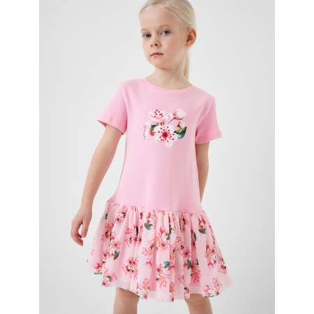 Нарядное детское платье для девочки. Модель из комбинации хлопкового трикотажа интерлок и сетки. Верх выполнен в виде футболки в нежно-розовом цвете и украшен ярким цветочным принтом на груди. Пышная юбка с цветочным рисунком собрана по талии и придаёт изделию нарядный вид.