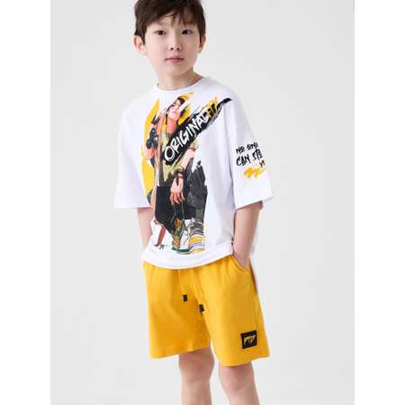 Костюм для мальчика подростка. Состоит из футболки и шорт. Выполнен из хлопкового трикотажа. Футболка оверсайз, с коротким рукавом. Яркий принт в скейтерской тематике. Шорты свободные, с эластичным поясом и шнурком для регулировки посадки. По бокам расположены карманы. Сзади - накладной карман.