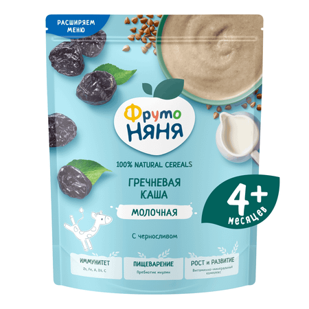 Сухая молочная гречневая каша ФрутоНяня с черносливом отлично подходит для первого прикорма детей от 4 месяцев. Ведь гречка — гипоаллергенный продукт, который идеально дополнит рацион малышей раннего возраста. Гречневая каша ФрутоНяня вкусная и полезная, у нее натуральный состав без красителей, консервантов и ГМО. Каша дополнительно обогащена важными нутриентами. Среди них - витамины Е, PP, B2, B1, B6, B12, биотин, пантотеновая и фолиевая кислоты и йод. А ещё витамины A, C, D3 и минеральные вещества: цинк, железо, необходимые для поддержания иммунной системы. Пребиотик инулин в составе способствует комфортному пищеварению. Вкусная и полезная каша станет любимым завтраком малыша, обеспечив его чувством сытости и энергией надолго.