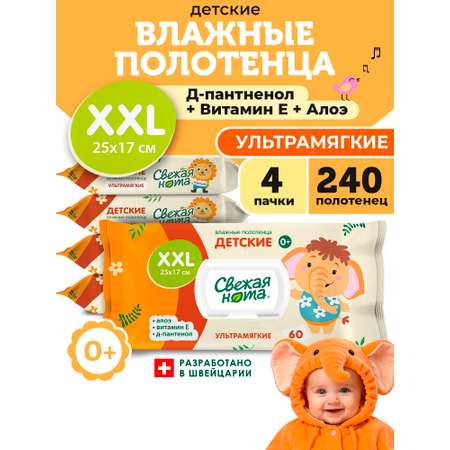 Влажные полотенца для детей ультрамягкие от бренда СВЕЖАЯ НОТА незаменимый помощник для мамы и малыша. Наши влажные салфетки для детей произведены из высококачественного материала Natlace, который особенно нежный в использовании, дает ощущение шелка, сохраняет идеальный баланс влажности и прочности салфетки. Мягкие гипоаллергенные детские влажные полотенца из бережно очищают нежную детскую кожу. Безопасная формула лосьона с Д-пантенолом, алоэ и витамином Е успокаивает, увлажняет и питает нежную детскую кожу, предотвращая раздражения и воспаления. Влажные детские салфетки большого размера XXL не содержат спирт, парабены и красители, не мылятся и не прилипают. Влажные полотенца для новорожденных незаменимы при смене подгузника в условиях отсутствия воды и мыла, разрешены для использования с первых дней жизни. Влажные полотенца XXL хорошо увлажнены и имеют большой размер 25х17 см. Влажные салфетки можно использовать для снятия макияжа и косметики, в уходе за детскими игрушками, для сумки в роддом, в поездке на автомобиле, самолете, поезде, в походе, можно использовать для интимной гигиены женщин и мужчин. Многоразовый пластиковый клапан надежно защищает полотенца от высыхания. Набор влажных полотенец включает в себя 4 упаковки по 60 листов.