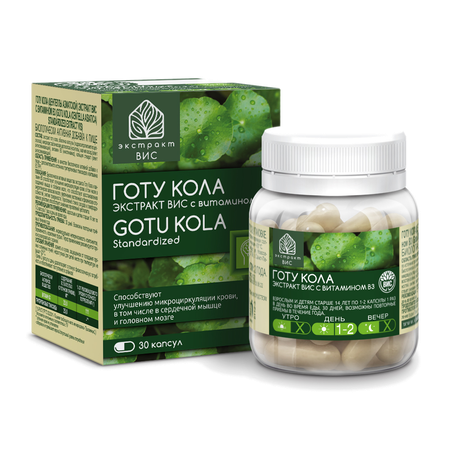 ГОТУ КОЛА считается одним из самых важных омолаживающих растений в аюрведической медицине, йоги используют его для улучшения медитации. Хотя его название похоже на ""орех колы"", Готу кола не содержит кофеина. Биологически активные вещества Готу кола способствуют поддержке здоровой функций нейротрансмиттеров: тритерпеновые гликозиды (сапонины) стимулируют выработку ацетилхолина — нейромедиатора возбуждения, посредством которого осуществляется проводимость нервных импульсов между нейронами. Это свойство растения в сочетании с питательной поддержкой витамина группы В обуславливает успокаивающее действие Готу колы, применение действует успокаивающе при различных тревожных состояниях. Успокаивающие свойства готу колы способствуют восстановлению энергии, снимают усталость как умственную, так и физическую, помогают преодолеть беспокойство и снять напряжение. Активные компоненты Готу Кола способствуют улучшению циркуляцию крови в сосудах головного мозга, улучшению памяти, концентрации внимания, интеллекта и речевой функции. Компоненты растения способствуют активному долголетию. Кроме улучшения мозгового кровообращения, биоактивные соединения Готу Кола способствуют улучшению кровообращения в ногах, снижению проницаемости сосудистых стенок, предупреждению развития отёков, а также за счёт улучшения циркуляции крови и лимфы, приём экстракта готу колы поддержка в борьбе с целлюлитом.