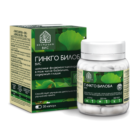 Компоненты препарата «Гинкго Билоба - ВИС» способствуют улучшению деятельности мозга, улучшению памяти. Рекомендуется в качестве источника флавонолгликозидов (в т.ч. байкалина), содержащего глицин "ЭКСТРАКТ ВИС - российские растительные биодобавки для поддержки здоровья. При производстве ЭКСТРАКТ ВИС используются стандартизированные экстракты растений, что обеспечивает высокую точность дозирования и контролируемый уровень содержания активных веществ в 1 капсуле.