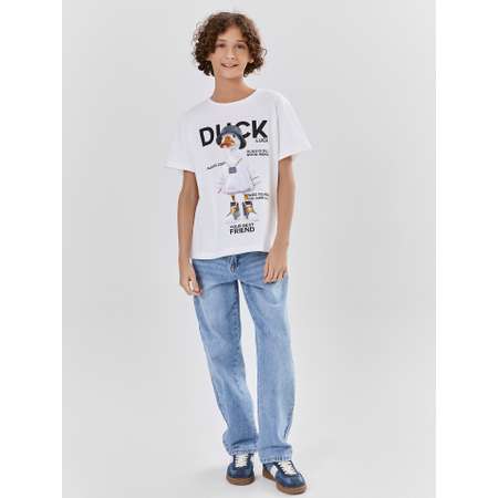 Добавьте яркости в повседневный гардероб вашего ребенка с трендовой футболкой от популярного бренда Mark Formelle. Модель в классическом белом цвете с забавным и стильным принтом «DUCK» — это идеальное сочетание актуального кроя оверсайз и безупречного комфорта на каждый день.