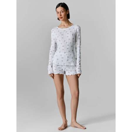 Эта пижама для женщин состоит из джемпера с длинным рукавом и кокетливых шорт — идеальное воплощение эстетики домашнего уюта и женственности. Уникальное ажурное плетение ткани с деликатными сквозными узорами придает пижаме визуальную воздушность и изысканный вид. Мягкий цветочный принт на белом фоне добавляет образу романтичности и свежести.