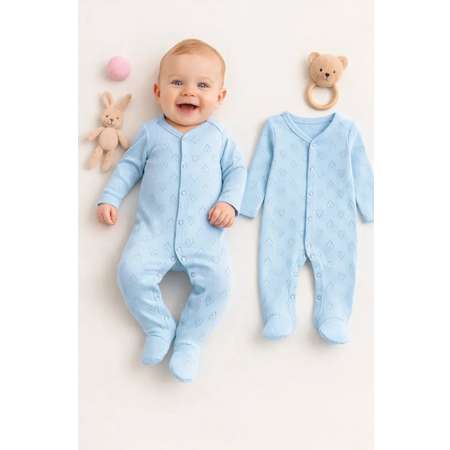 Премиальная ажурная рибана: Мы используем высококачественное трикотажное полотно (97% хлопок, 3% эластан). Ажурная фактура не только выглядит изысканно, но и обеспечивает идеальный воздухообмен — кожа малыша «дышит», что предотвращает перегрев и опрелости.