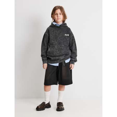 Подростковые длинные шорты для мальчика — это удобная модель для спорта и стильных расслабленных образов. Удлиненные шорты выполнены из хлопкового футера с петлями на изнанке, что делает их подходящими для ношения в теплое время года. Пояс на резинке дополнительно регулируется шнурком, благодаря чему модель модно подогнать под индивидуальные параметры ребенка. Изделие дополнено прорезными карманами по бокам и одним накладным сзади. Черные шорты до колена подойдут как для урока физкультуры, так и для повседневного образа в спортивном стиле. Модный эффект стирки придает выразительный акцент с винтажными нотками. Стилизуйте шорты в многослойном образе с рубашкой и худи.
