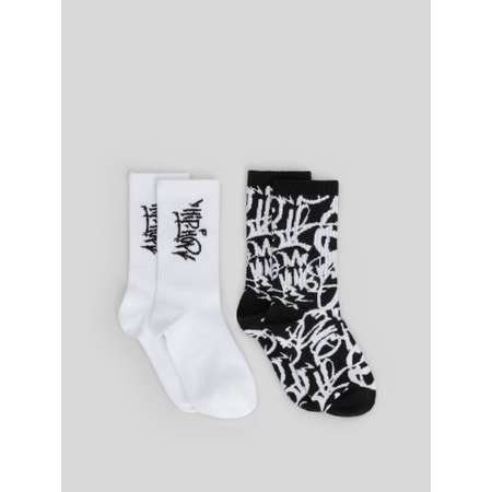 Набор из двух пар детских носков для мальчика представляет собой стильное дополнение образов. В комплект входят две пары носков разного цвета — черная, полностью покрытая принтом в стиле граффити и белая с принтом на голени. Носки изготовлены из мягкой и дышащей хлопковой пряжи, которая подходят для длительного повседневного ношения. Высокие хлопковые носки удобно садятся по ноге и не сползают даже при активных играх или занятиях спортом. Базовые цвета позволяют легко комбинировать изделия с одеждой разных цветов. Стильный рисунок придаст образу стильный штрих и гармонично дополнит его.