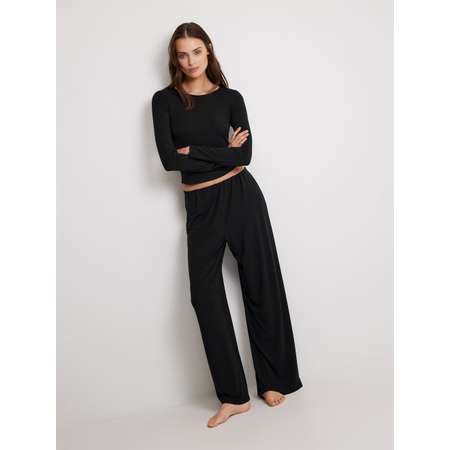 Женские черные брюки свободного кроя — это стильная модель для создания образов, наполненных комфортом. Брюки изготовлены из эластичного смесового полотна, которое приятно ощущается на коже и подходит для длительного ношения. Модель полной длины подходит для ношения с разными видами обуви: на плоской подошве, а также небольшом каблуке или танкетке. Свободный силуэт дарит легкость движений и тем самым создает утонченный образ. Широкий и комфортный пояс на резинке обеспечивает удобную посадку для разных типов фигуры. Брюки помогут составлять образы в повседневном стиле. Комбинируйте модель с черным лонгсливом для создания универсального и практичного образа.