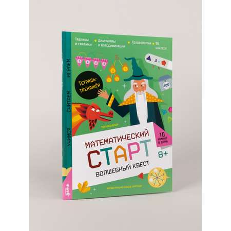 Математический старт. Волшебный квест — тетрадь-тренажёр, которая поможет ребёнку от 8 лет без страха и скуки освоить мир чисел, таблиц, графиков и научиться анализировать данные.