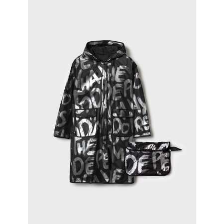 Укороченный плащ-дождевик для девочки-подростка с серебряным шрифтовым принтом в коллекцию. Капюшон с утяжкой. Застежка на кнопки. Материал ЭВА. Без подкладки. Модель имеет спереди два накладных кармана с клапаном. Добавлена петелька под капюшоном с внешней стороны, чтобы остальные вещи на вешалке не намокали. Сзади есть светоотражающая полоска. Идеально подходит для парного образа мама-дочь, так как такая модель есть в размерах для взрослых. В комплекте идет непромокаемая сумочка.