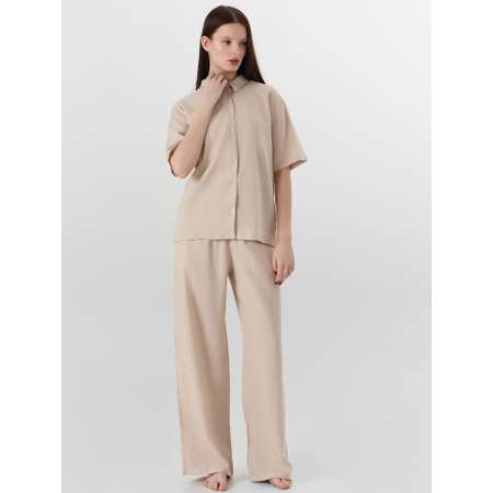 Элегантный дизайн: Свободная рубашка с коротким рукавом и прямые брюки создают расслабленный, но при этом дорогой образ. Цвет «светло-бежевый» подчеркивает естественную красоту и свежесть.