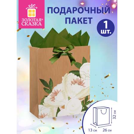 Подарочный пакет "Flower Kraft" ЗОЛОТАЯ СКАЗКА – это идеальное решение для тех, кто ищет стильную и надежную подарочную упаковку. Выполненный из прочной крафт бумаги плотностью 210 г/м2, этот пакет подарочный надежно сохранит содержимое, а его размер 26х13х32 см удобно подходит для разных подарков – от небольших сюрпризов до большого презента. Яркий дизайн с глиттером и ленточными ручками из полиэстера придает изысканный и праздничный вид, делая упаковку по-настоящему особенной. В комплекте идет нежная бумага тишью, которая подчеркнёт значимость подарка и добавит шарм. Этот пакет подарочный с днем рождения станет прекрасным выбором для упаковки на любой праздник, добавляя настроение радости и тепла. Если вы ищете качественные крафт пакеты или пакетики для подарков, этот вариант станет надежным и стильным решением для вашего дня рождения и других важных событий.